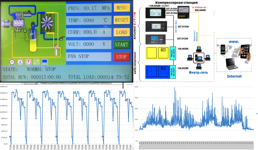 Как правило, воздушные компрессоры очень просто взаимодействуют с ЦВК через порт RS 485. Кроме того, мониторинг и доступ к системе можно осуществлять удаленно через VPN-клиентов веб-сервера по всему миру, а интерфейс позволяет передавать данные всем типам систем внутреннего управления АСУТП, поддерживая распространенные протоколы Modbus Profi-Bus и т.п.