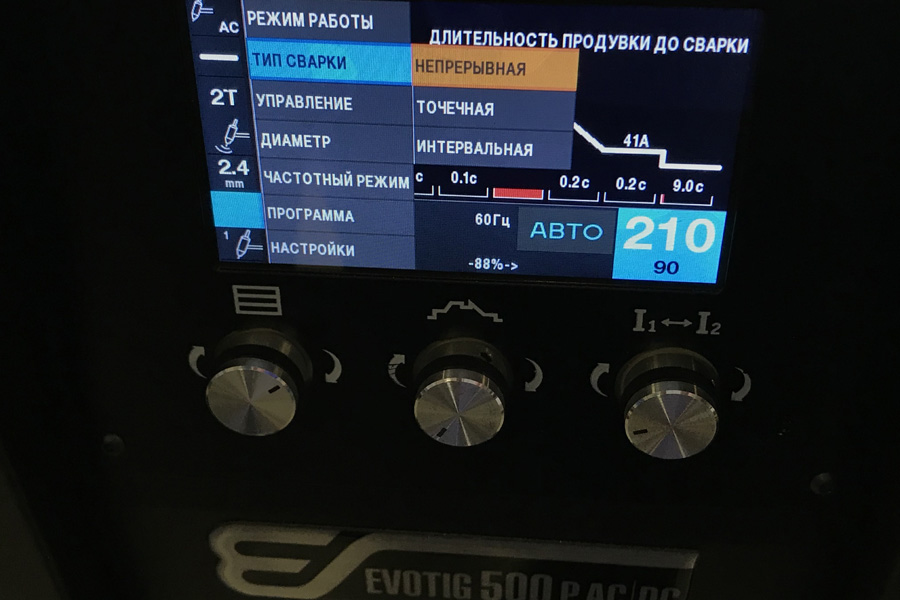 Одной из главных особенностей источников «EVOTIG P» является широкий спектр профессиональных настроек и различных режимов для большинства задач при сварке TIG. При этом сварочный аппарат имеет интуитивно понятный русифицированный интерфейс управления на большом цветном дисплее.