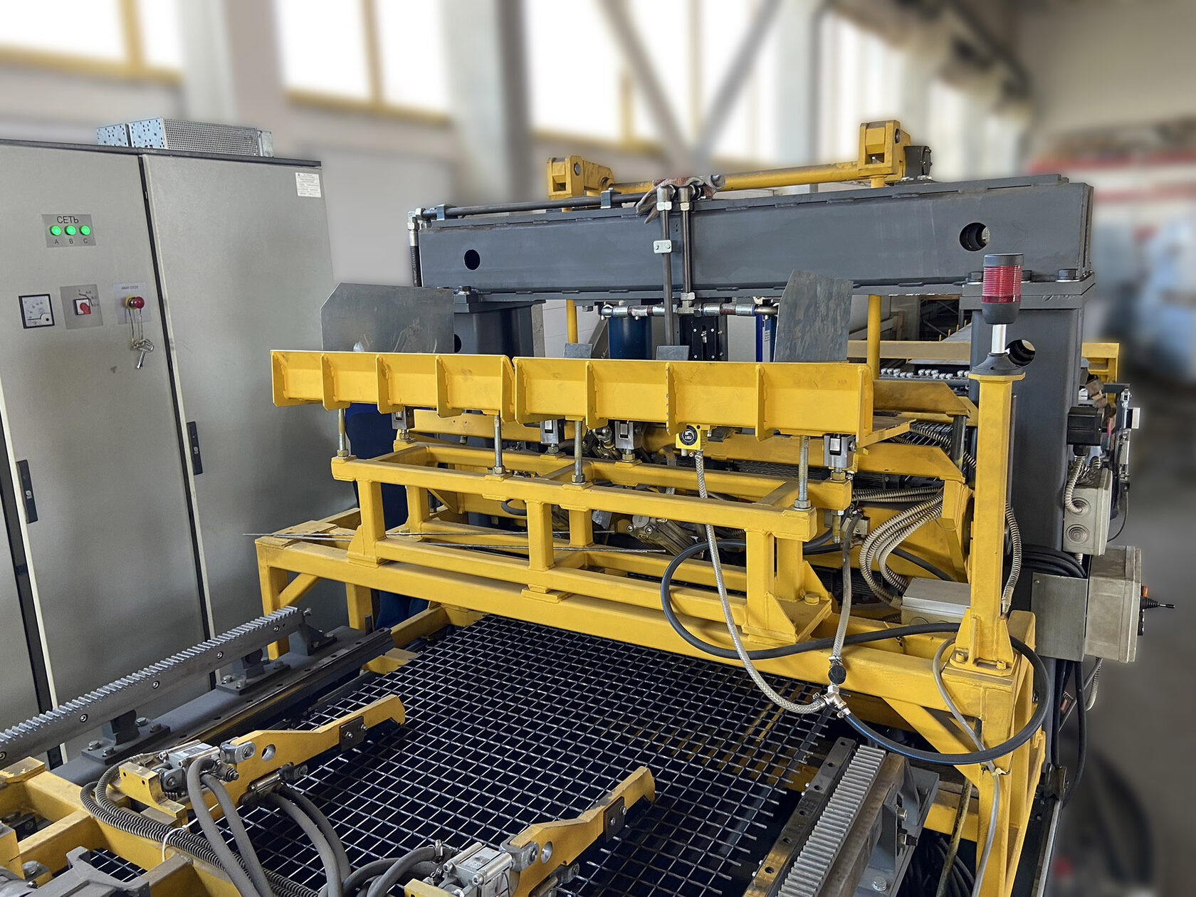 При движении полотна из зоны сварки на приемный рольганг происходит автоматическая обрубка выступающих концовсвязующего прутка гидравлическими ножницами и рихтовка полона встроенным в линию механизмом. После сварки всего изделия каретка дополнительным шагом досылает полотно на приемный рольганг под пакетировщик и возвращается в исходное положение. После этого перекладчик с захватами опускается вниз, захватывает сваренный настил и переносит его на позицию пакетировки.