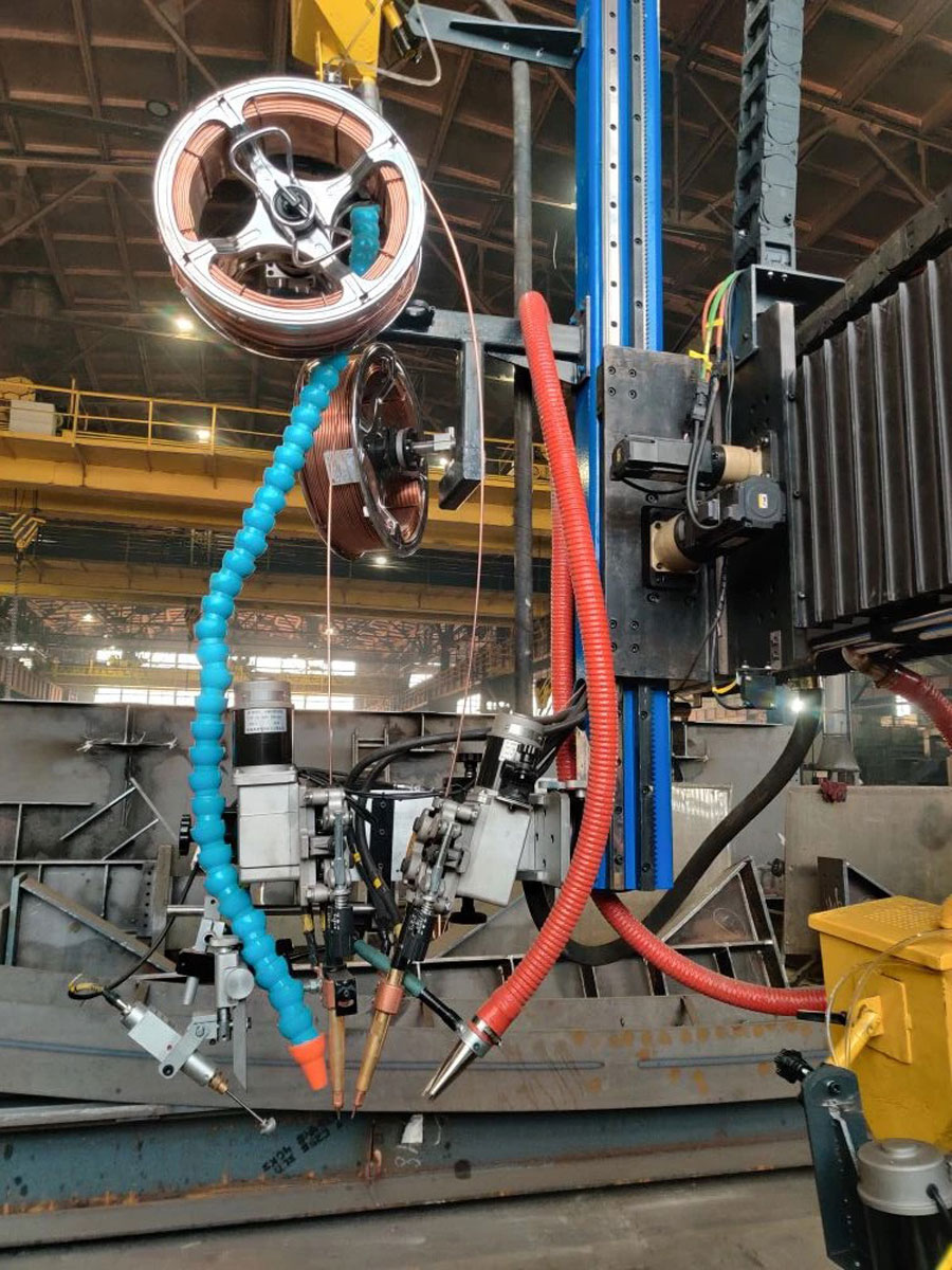 Сварочная головка состоит из двух головок для однодуговой сварки под слоем флюса в левом и правом исполнении, которые установлены на специальном кронштейне, позволяющем регулировать расстояние и угол между токоподводами.