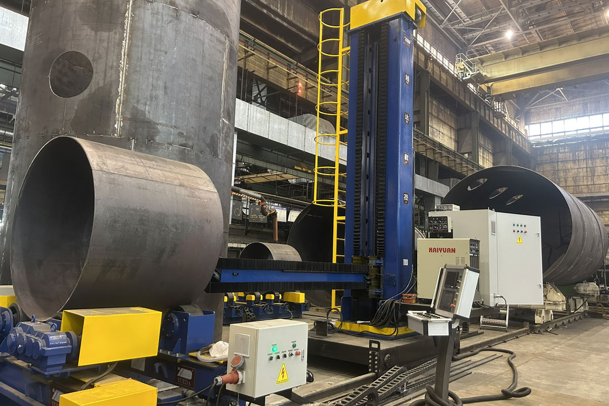 Сварочная колонна, оснащенная оборудованием для сварки под флюсом, имеет возможность производить сварку стыковых и угловых, продольных и кольцевых швов по цилиндрическим изделиям диаметрами от 700 до 3600 мм. Рабочий ход колонны 4000 х 6500 мм, а угол поворота ±180 о с помощью механизированного привода.