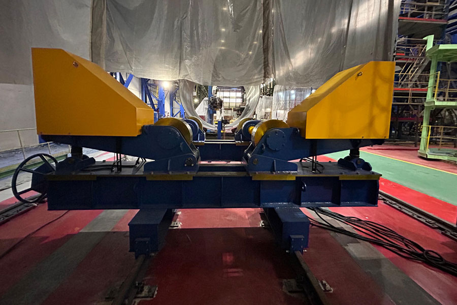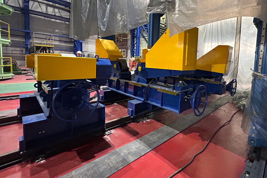 Роликовые вращатели устанавливаются на рельсовые направляющие для обеспечения продольного позиционирования роликовых опор в процессе подготовки сварочного стенда.