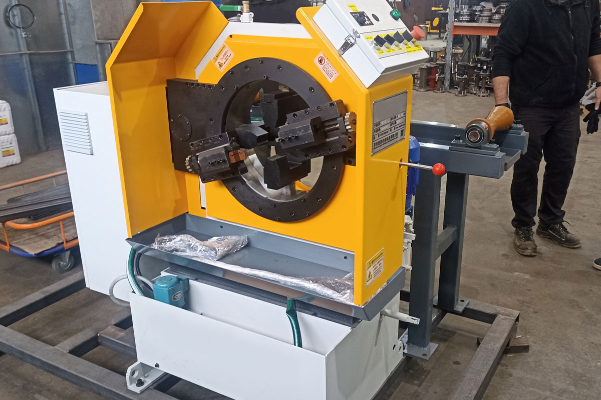 Станок состоит из самого корпуса станка, режущей головки и роликовых направляющих для подачи трубы.