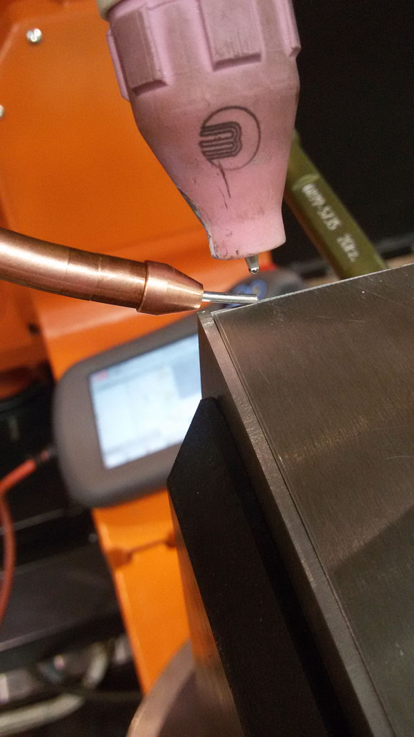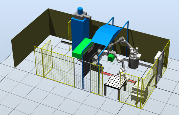 Работа манипуляторов синхронизирована – во время приварки кронштейнов сварочный робот ждет, пока подающий робот возьмет кронштейн с палетного стола и зафиксирует его на боковой стенке свариваемого изделия, затем обваривает доступные швы, остальные швы между кронштейном и изделием обвариваются после того, как подающий робот вместе с захватом уходит из рабочей зоны сварки.